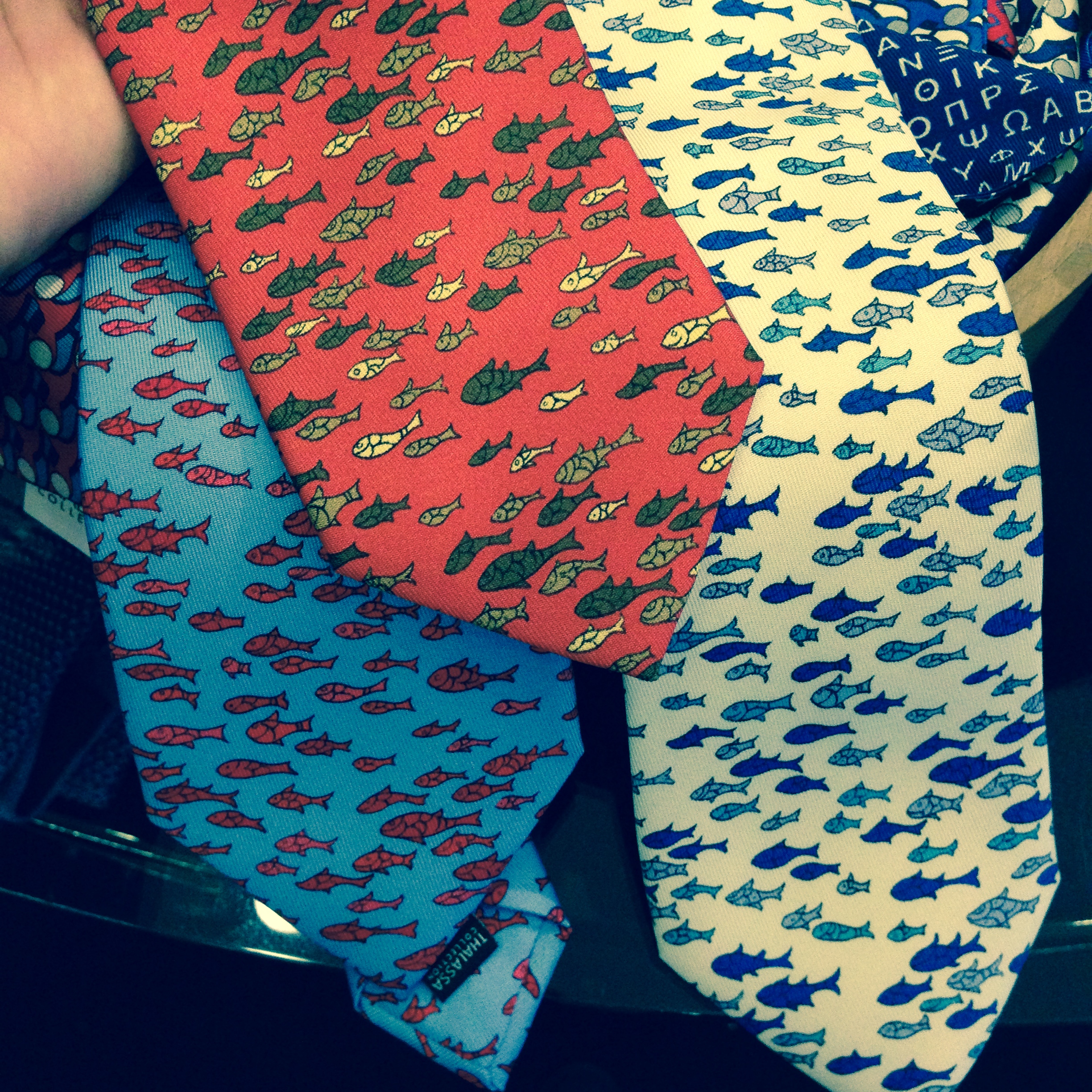 Le cravatte sono davvero belle e la seta non ha nulla da invidiare a quelle di Hermes. Le fantasie poi sono originalissime, ispirate alla Grecia (l’alfabeto greco, gli Euzoni ossia le guardie del Parlamento, le divertenti scarpine con il pon pon sulla punta indossate dalle guardie stesse…) o realizzate ad hoc per il Benaki Museum di Atene (come quelle con la fantasia con i pesciolini).