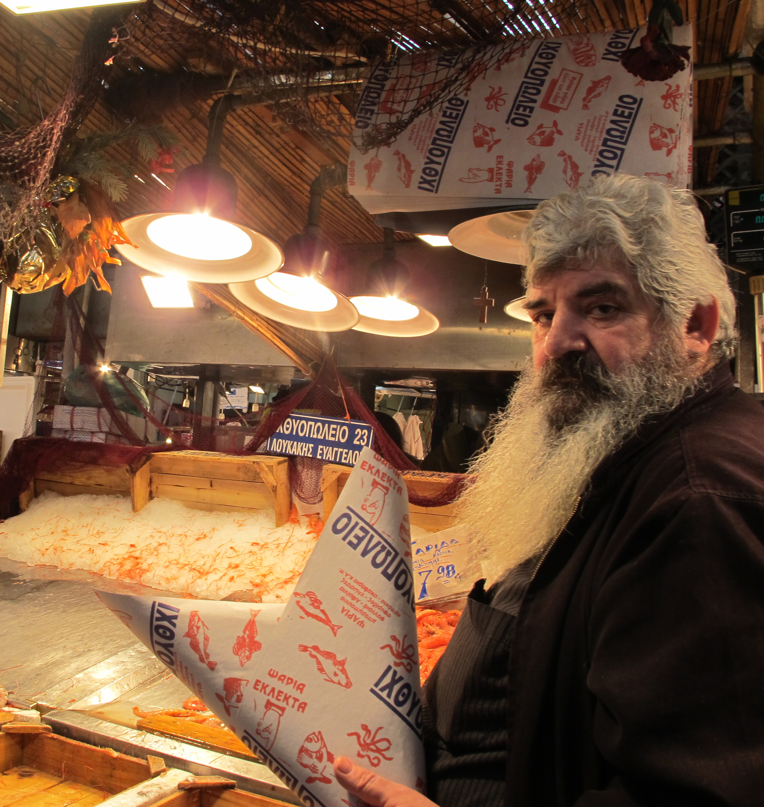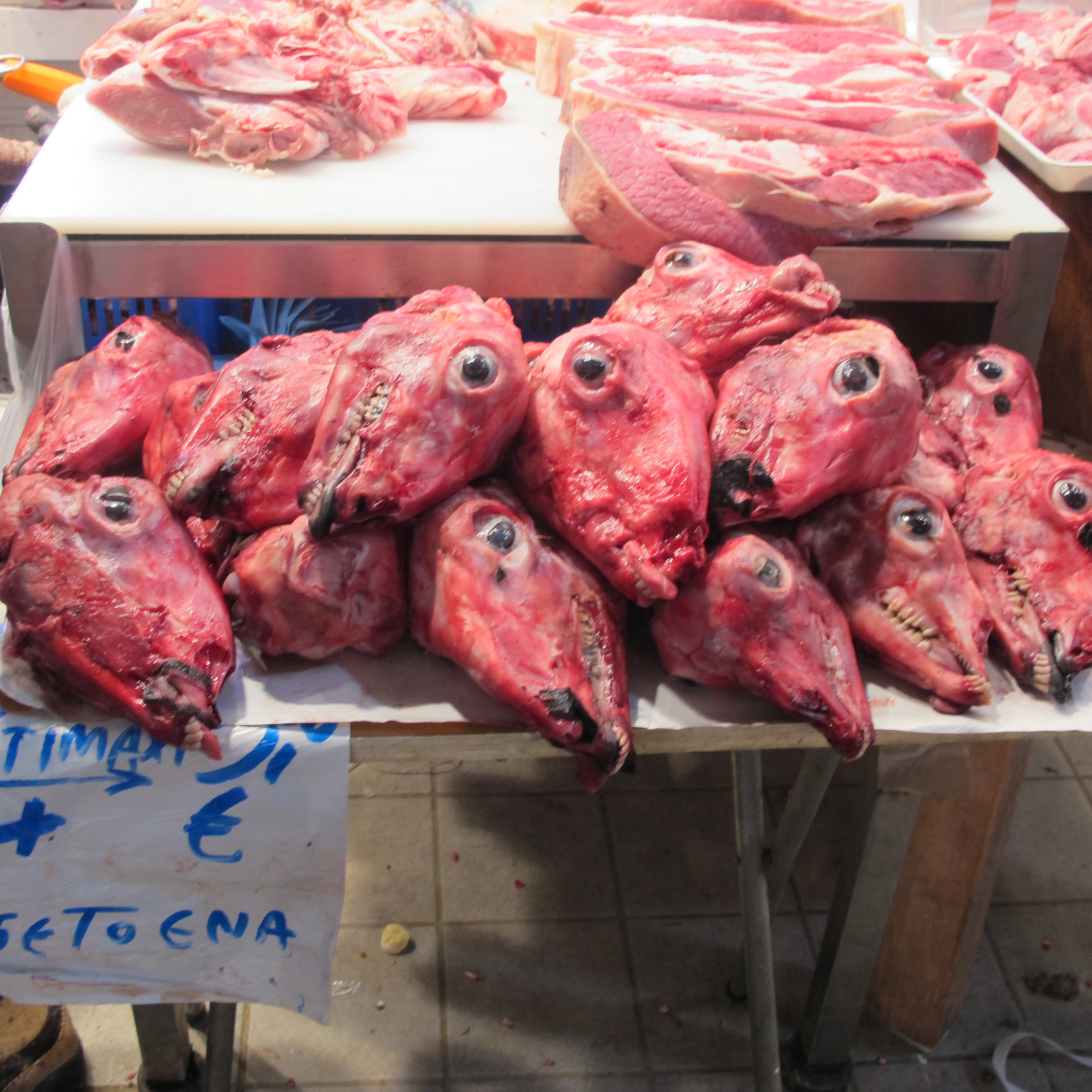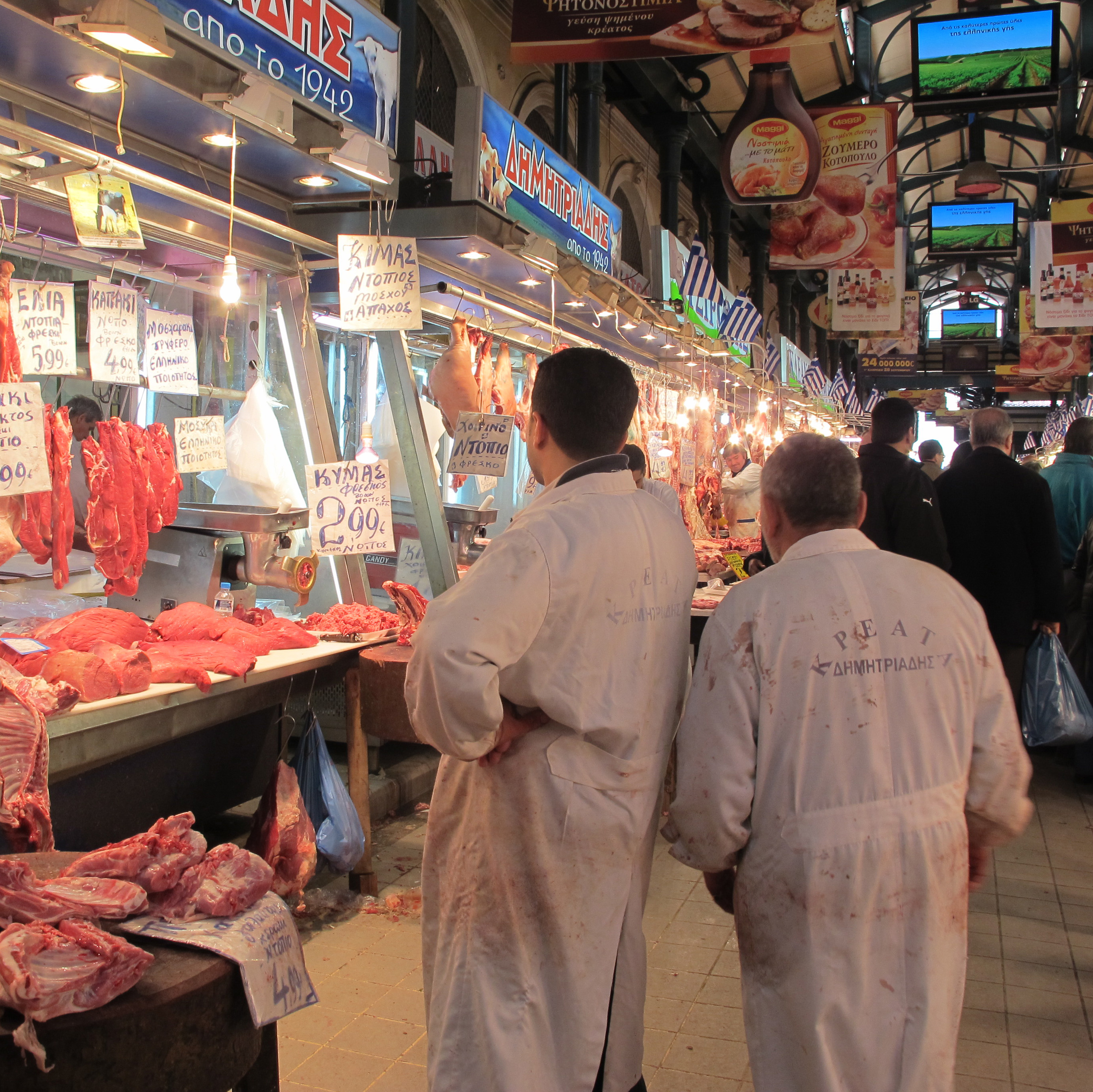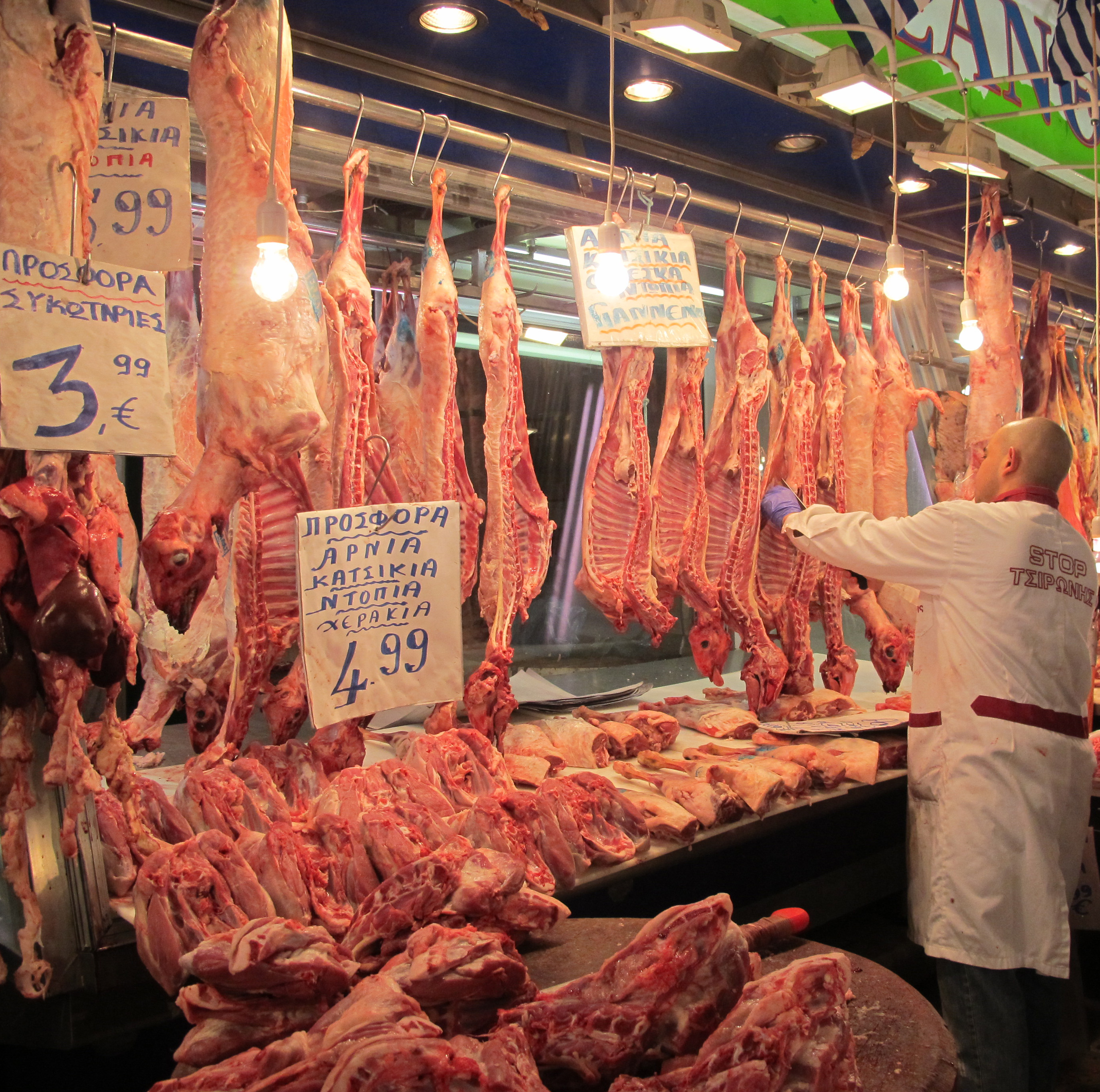 Il “girone” esterno invece alla carne e ogni venditore ha a disposizione un bel tavolo-tagliere rotondo che userà con ferocia per tagliare il pezzo da voi scelto. Sappiate che non troverete mai il vitello; qui in Grecia non si mangia, pare che sia proprio proibito. Però manzo, agnello e maiale sono in abbondanza.