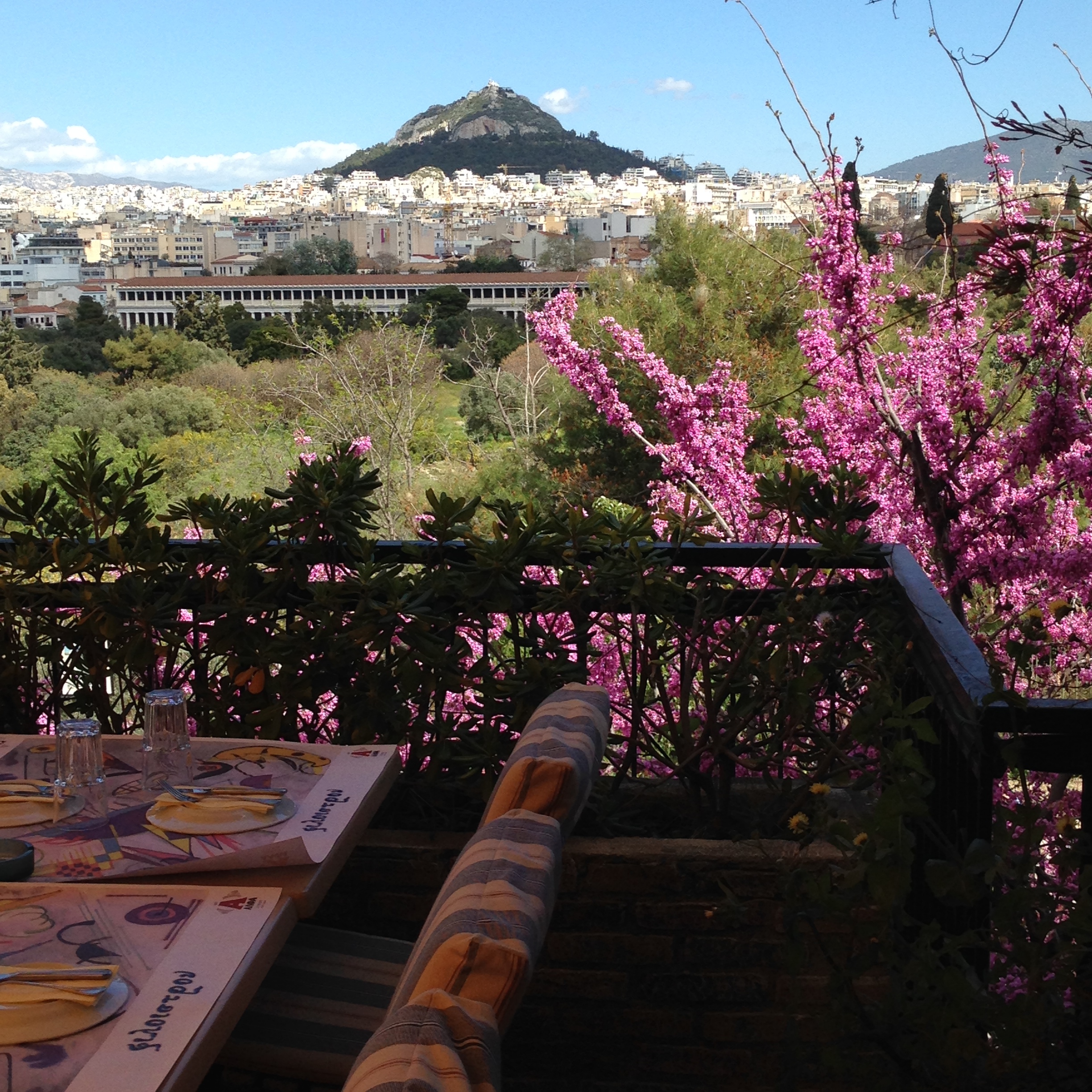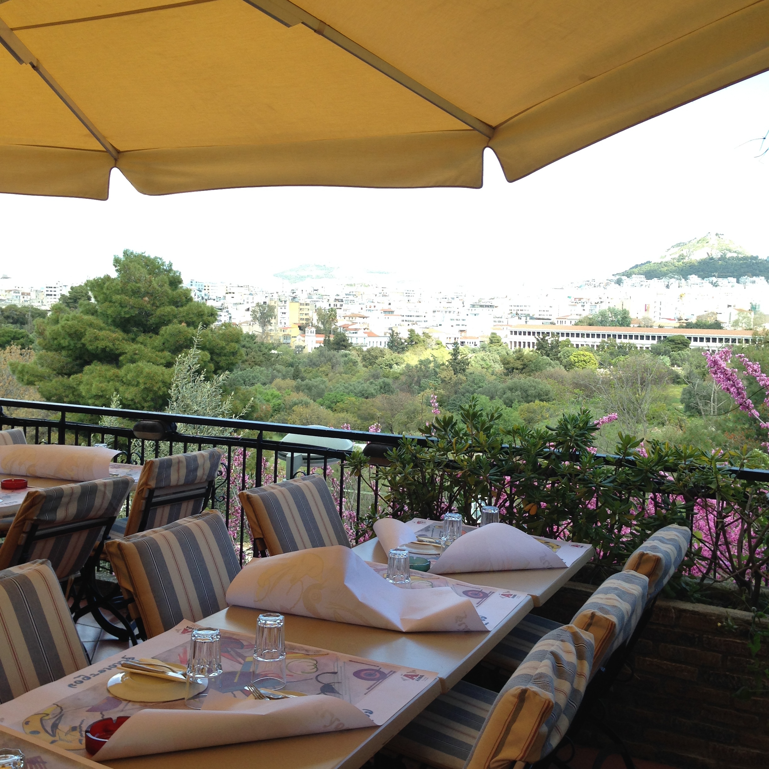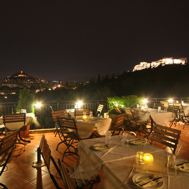Dispone di una sala a livello della strada, adatta per le serate invernali, ma la vera “chicca” è la bella terrazza da cui in primavera ed estate potrete godere di una delle più belle viste dell’Acropoli.