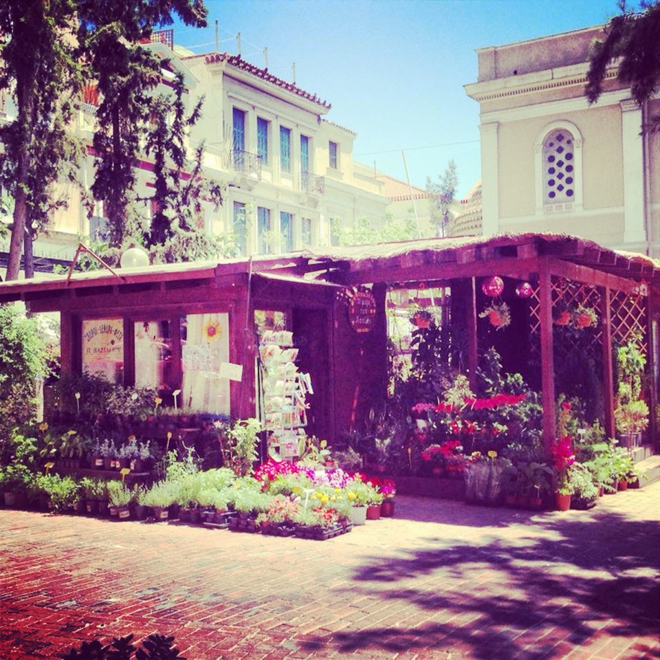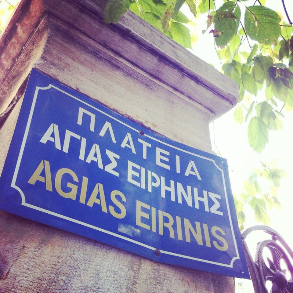 La piazza di Agia Eirini, si trova nella parte nord-est rispetto alla nota piazza Monastiraki e fa parte di un blocco pedonale che connette la popolare via Ermou con la Aiolou street, parallela alla caotica e rumorosa via Atinas, dove si trova anche il mercato rionale di Atene. Prende il suo nome dalla chiesa di san Agia Eirini che domina la piazza ed è circondata su ogni lato da diversi caffè e bistrot. Le terrazze dei bar si estendono fino al chiosco di fiori che si trova proprio al centro della piazza.