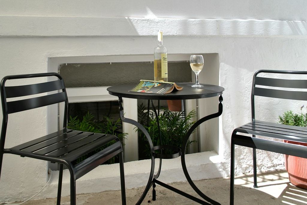 Entrando dalla strada, si sale qualche scalino di un portone storico in legno, e si arriva nel corridoio che separa le due parti principali della casa dedicate a tutti gli ospiti: saloncino con poltroncine vintage e libreria colma di libri insieme ad una mappa della grecia ideata da John e cucina dotata di un ampio tavolo comune dove gli ospiti possono cenare assieme ma soprattutto godere della colazione che lo stesso titolare prepara ogni mattina ai suoi clienti. Dal piccolo corridoio la luce che penetra nell’ambiente ci fa arrivare nel patio comune a tutti gli ospiti che ospita piante e fiori e un bel tavolo dove godersi la prima colazione.