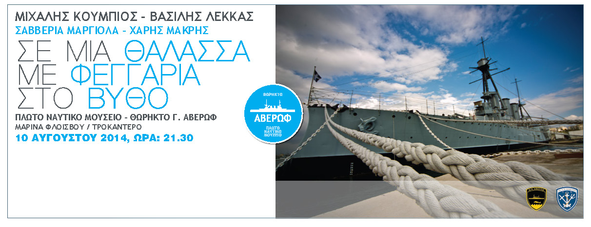 Il Museo Navale Battleship “G. Averof” presenta il concerto “Luna scintillante sul mare” di Domenica 10 agosto alle ore 21.30 per celebrare la luna piena. Michalis Koumbios (compositore), Vassilis Lekkas (cantante) e due nuovi artisti Saveria Margiola e Charis Makris ci guiderà in questo viaggio musicale. Il programma prevede brani della discografia di Michalis Koumbios ‘, il suo mondo composizioni di fama internazionale dedicate al mare, ma comprende anche brani dagli album di Vassilis Lekkas e Saveria Margiola così come le canzoni di compositori greci illustri dove i temi dominanti della narrazione sono la Luna e il Mare.