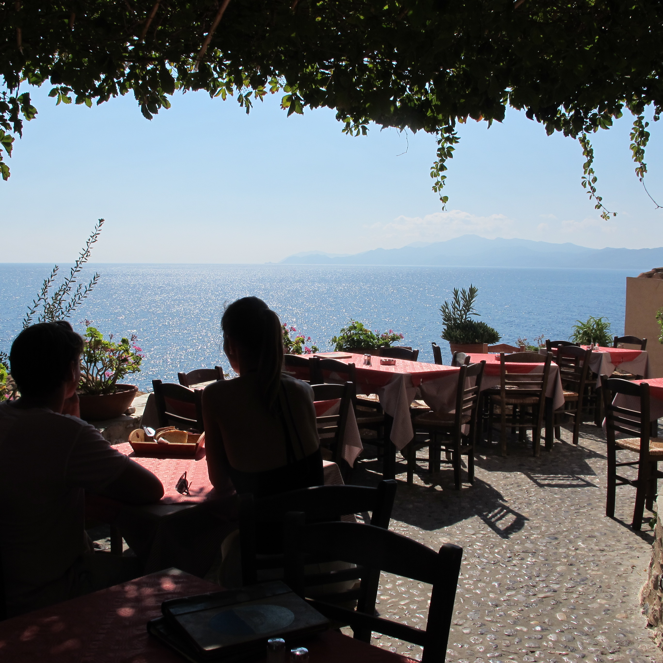 Amici greci ci consigliano un altro ristorante, più elegante, che purtroppo non abbiamo potuto provare questa volta. Le sale interne hanno grande atmosfera con camini in pietra e luci soffuse, la terrazza ha una splendida vista sul mare. Si chiama Chrisovoulo, visitatene il sito http://www.chrisovoulo.gr. Qui troverete anche il menù con i prezzi.