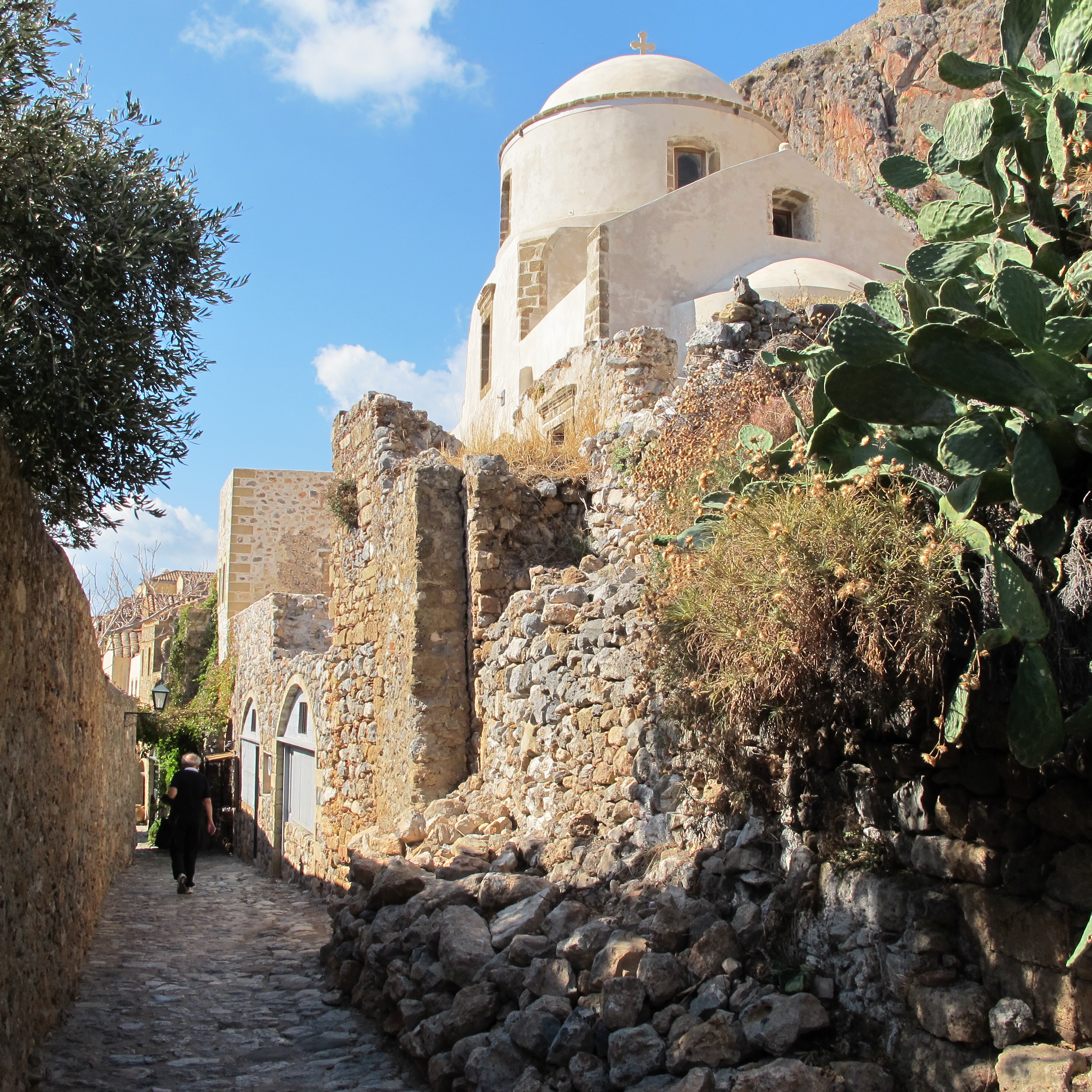 Collegata alla terraferma da una sottile striscia di terra lunga 400 m., La Rocca di Monemvasia è stata soprannominata la Gibilterra del Mediterraneo orientale. Il nome in greco significa “Un unico accesso” ed in effetti appena finita la breve strada sull’istmo che la collega alla terraferma, si trova subito un grande portone d’ingresso, come quello di un vecchio palazzo delle nostre città.