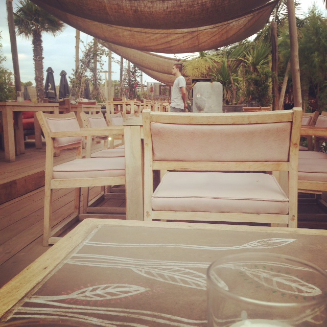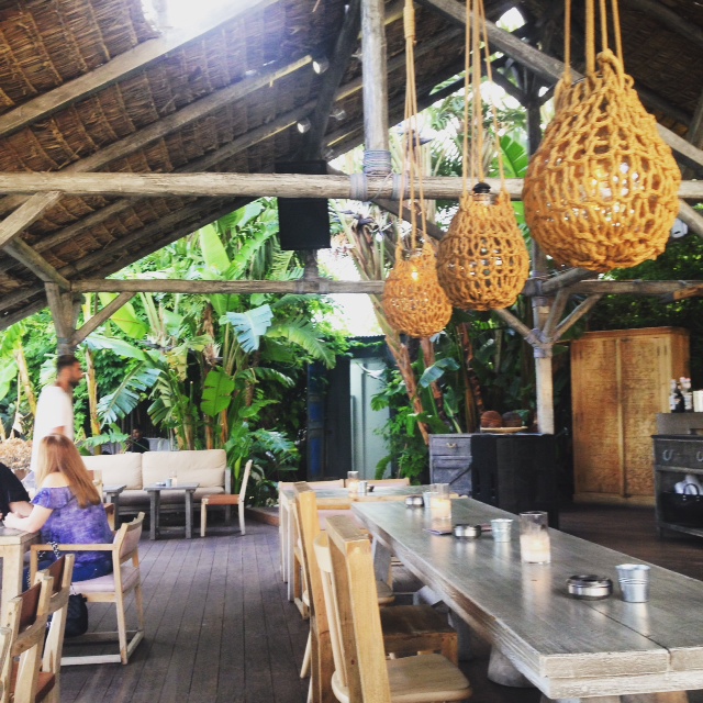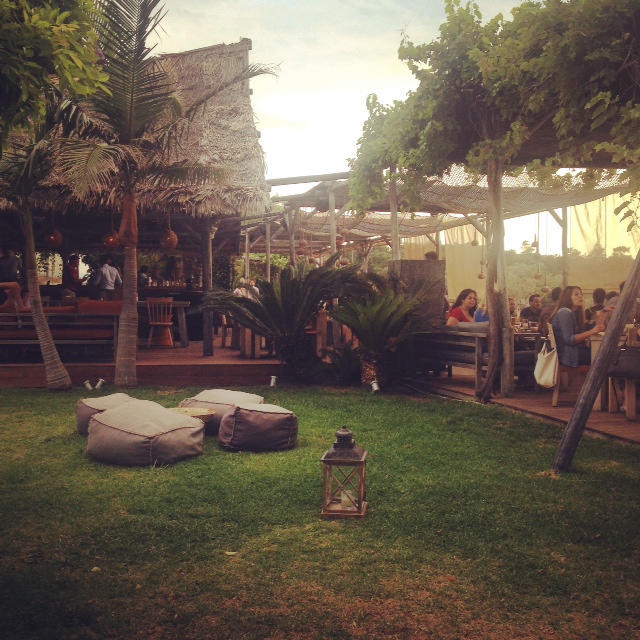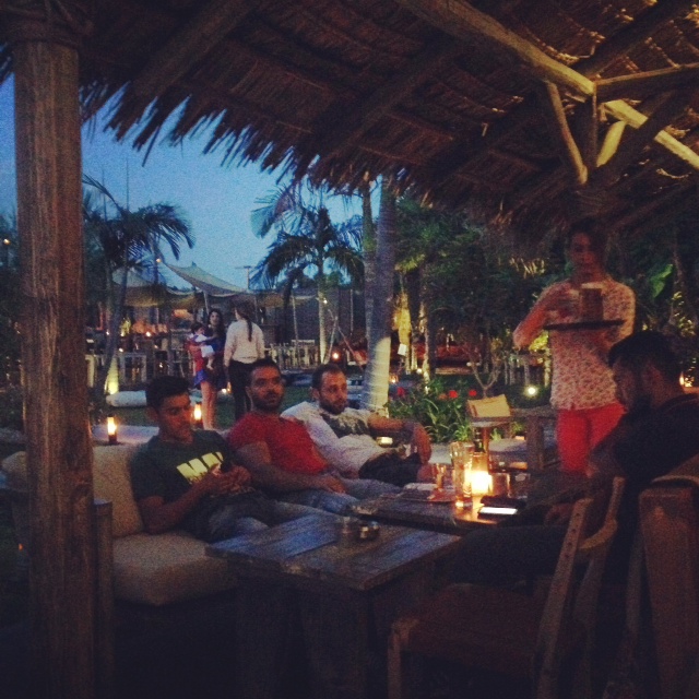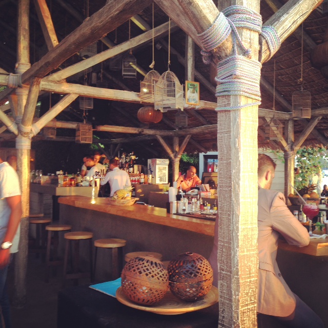 Il chiosco del bar é costruito in legno e bambù e tutto intorno ci sono dei tavolini e dei cuscinoni sul prato dove potersi rilassare.
